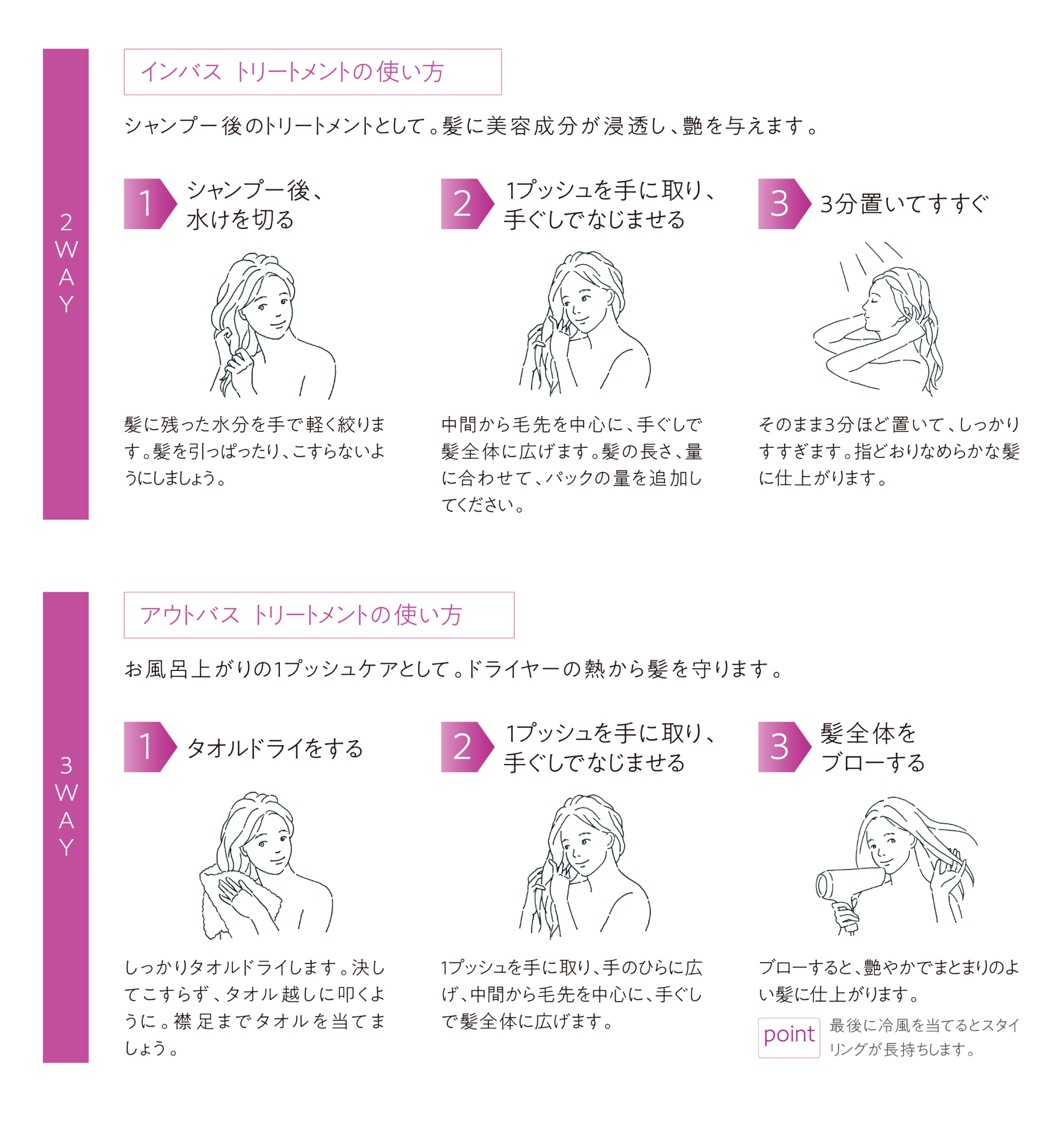 ・ダメージが気になる髪にたっぷりの潤いとツヤを与え、美しく艶やかにまとまります。